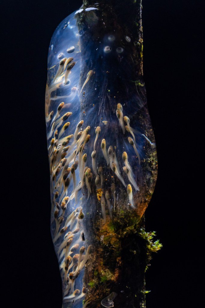 A Malagasy frog (Guibemantis sp.) egg clutch hangs on a small trunk next to a pond in Maromizaha rainforest, Madagascar. “The Maromizaha rainforest, where I spent six months collecting data for my PhD thesis, hosts an outstanding richness of amphibians, with at least 74 endemic species. For many Malagasy frogs, reproduction peaks correspond with winter months, a period characterized by higher temperatures and intense rainfall,” said Carugati.