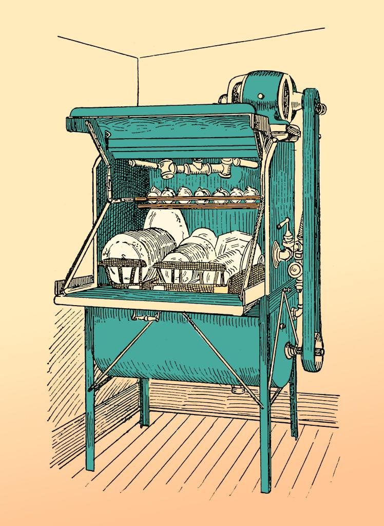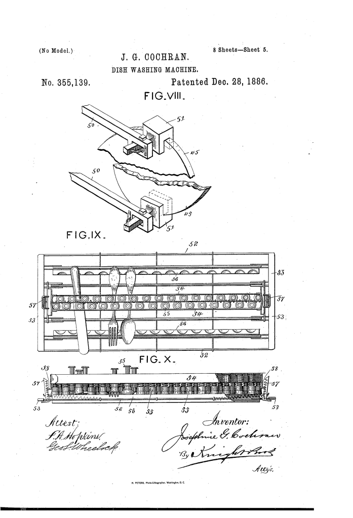 Cochrane fashioned a design that included water jets, a dishrack, wire interior compartments, and a motor-powered wheel that released soapy water. While she found it difficult to secure help — men “insisted on having their own way with my invention until they convinced themselves my way was the better,” she said — a mechanic named George Butters eventually built the prototype in 1886.