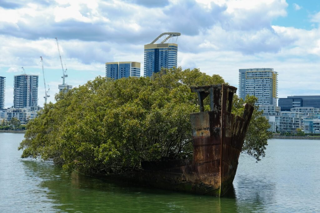 A former cargo freighter in Sydney, Australia, is now known as a “floating forest.” The century-old ship, built in 1911, can be seen in the city’s Parramatta River with greenery pouring over the sides and a thriving thicke of mangrove trees on board.
