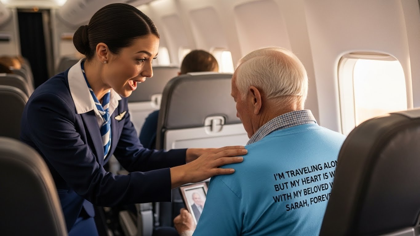 3. Flight Attendant Notices Elderly Man Traveling Alone – When She Reads His Shirt She Bursts Into Tears>