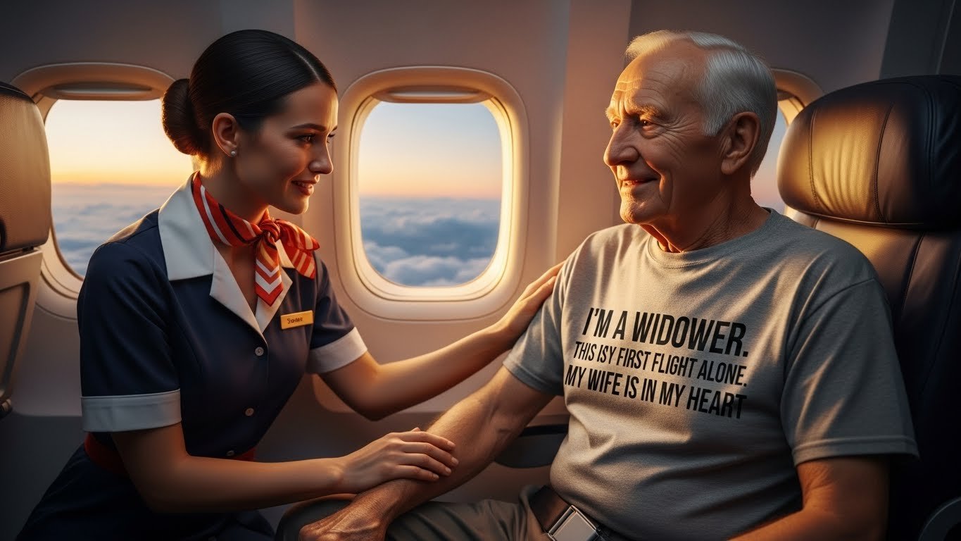 3. Flight Attendant Notices Elderly Man Traveling Alone – When She Reads His Shirt She Bursts Into Tears>