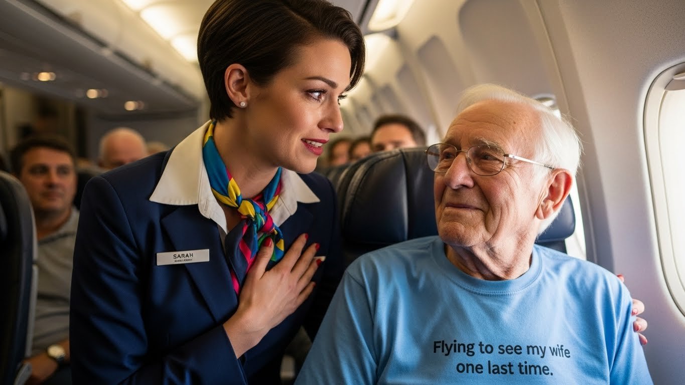 3. Flight Attendant Notices Elderly Man Traveling Alone – When She Reads His Shirt She Bursts Into Tears>