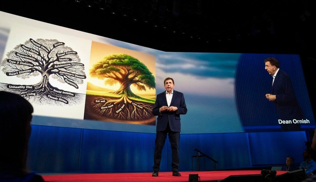Through his nonprofit, Preventive Medicine Research Institute, he found that these adjustments can often reverse coronary heart disease, Type 2 diabetes, and other conditions. When you change your lifestyle — which Ornish sums up as eating well, moving more, stressing less, and loving more — “it actually changes the expression of your genes,” he explained to audience members, adding: “Our genes are a predisposition but our genes are not always our fate.”