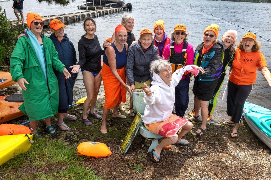 Founder Susan Baur (front) celebrates a haul with members of the Old Ladies Against Underwater Garbage.