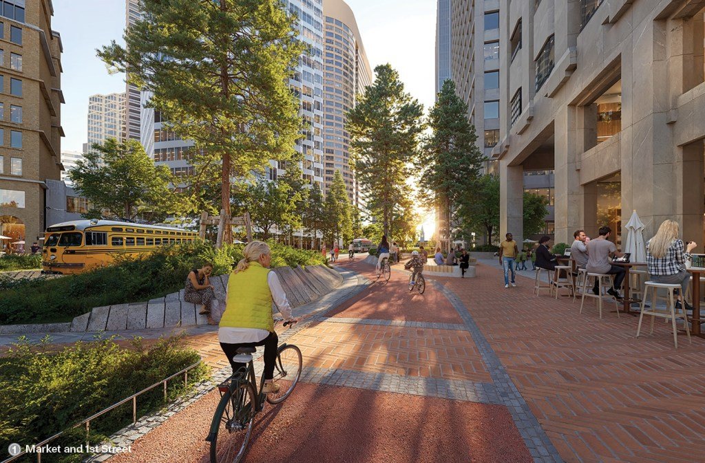 “The jury struggled to find what could be thought of as a powerful massive greening idea. While many submissions incorporated greenery at scale, few engaged deeply with the unique context and ecology of Market Street. This idea stands out for doing just that — albeit in a polemical way that, realistically, would take generations to realize (and might ultimately involve species other than redwoods). Jurors appreciated the dense tree planting and pedestrian-focused approach, noting that an investment in big trees on Day 1 would be critical to its success. That’s OK: This proposal doesn’t prescribe a specific landscape so much as it reveals a forest that has been waiting to emerge.”