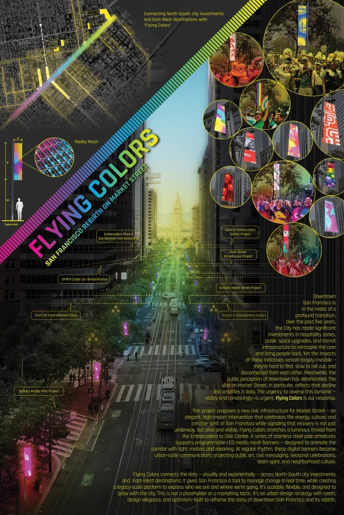 “In addition to ideas that addressed the big structural challenges of Market Street, the jury was also looking for some ideas that could happen quickly and relatively inexpensively. This idea takes the notion of traditional light pole banners and puts a technology and wayfinding twist on them. Instead of fabric, these digital media mesh banners also light up at night and connect the dots for all the activities, events and venues along and adjacent to Market Street.”