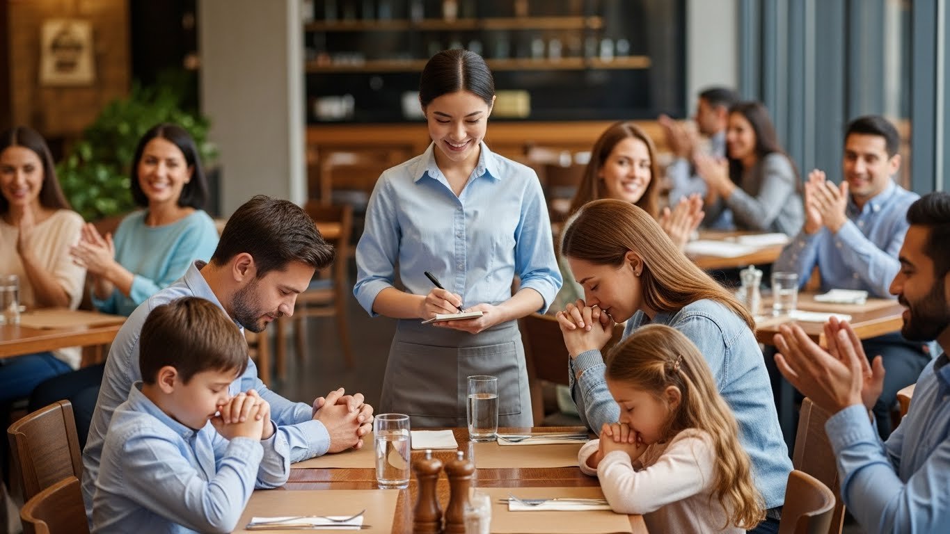 3. Server Notices Family Praying Before Meal – When She Joins Them The Restaurant Erupts In Applause>