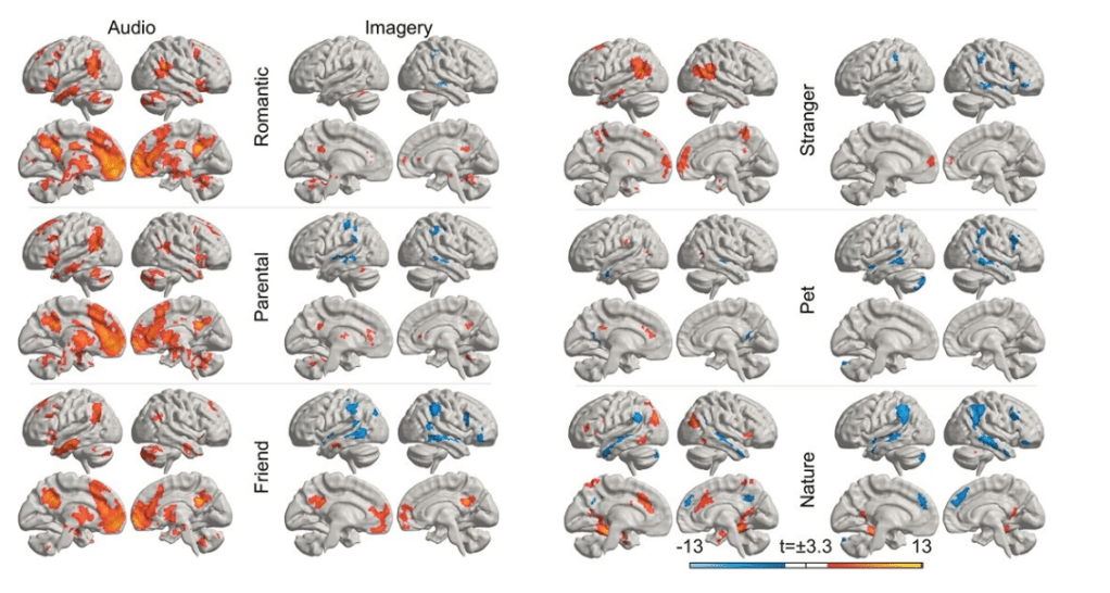 The researchers, who published their findings in the journal Cerebral Cortex, measured brain activity using functional magnetic resonance imaging, or fMRI. To pinpoint the areas that light up for love, 55 parents, self-described as being in loving relationships, were played short, recorded stories related to love for a child, romantic partner, friend, stranger, pet, and nature.