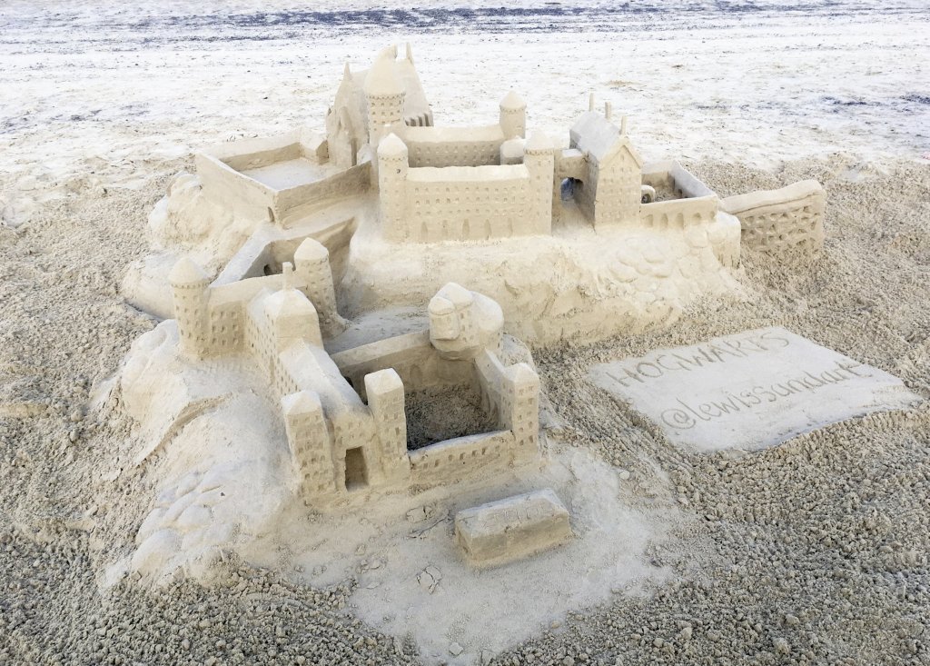 The sand sculpture that took Lewis the longest amount of time — around nine hours — was a massive Hogwarts castle from the Harry Potter books. “You are limited by the daylight and the tide, or both, so you have to account for that,” he explained. “As a family we made the entire Hogwarts — it took like seven of us over the entire day.”