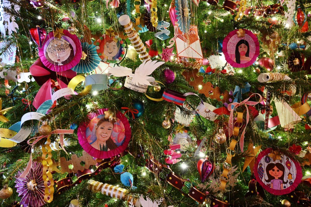 In the spirit of this year’s theme, a “season of peace and light,” thousands of paper doves and drawings made by children around the country are also on display, as well as florals and fruits in the Diplomatic Reception Room as a “nod to the importance of hospitality and grace to peaceful diplomacy.” (Fun fact: This room opened to the general public for the first time this fall — and if it looks familiar to the history buffs out there, that’s because it was the site of President Franklin D. Roosevelt’s famous fireside chats.)